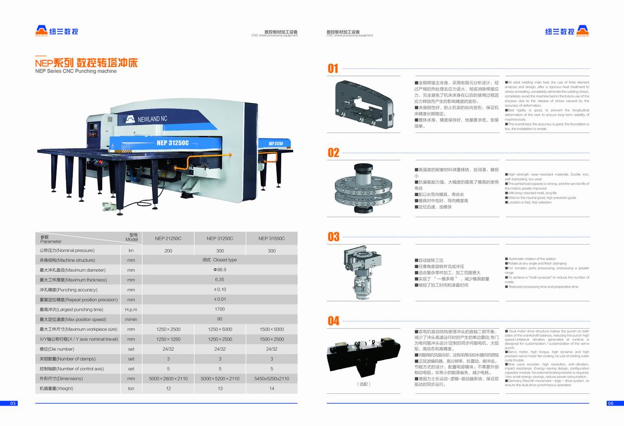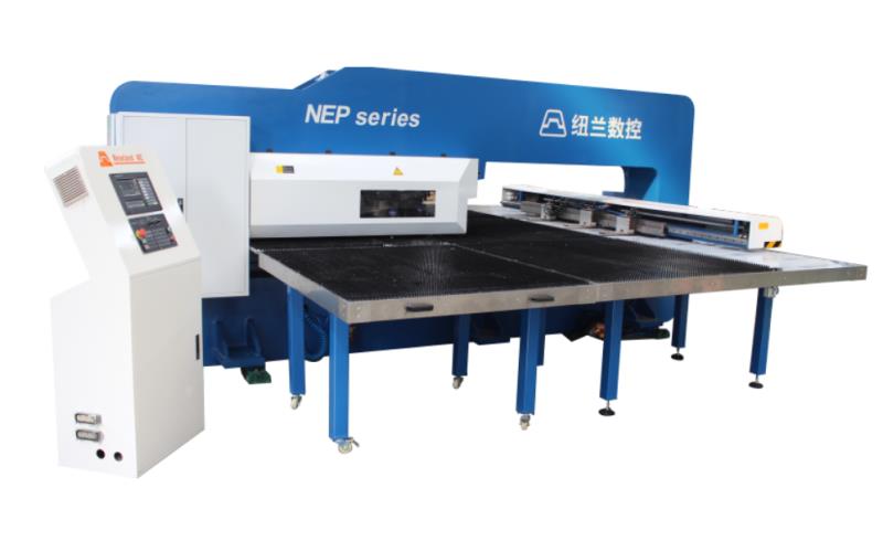 NEP系列全电伺服转塔冲产品介绍 数控转塔冲床是板材加工设备中最具生命力的产品,用于各类金属薄板零件加工,可以一次性自动完成多种复杂孔型和浅拉深成型加工。通过自动编程,可对板材进行X,Y方向的精确定位,自动选择转盘模具库中的模具,按程序加工不同尺寸和孔距的孔,也可用小冲模以步冲方式加工尺寸较大的各种形状的曲线轮廓,也可进行特殊工艺加工,如百叶窗,浅拉伸,沉孔,翻边孔,加强筋,压印等。